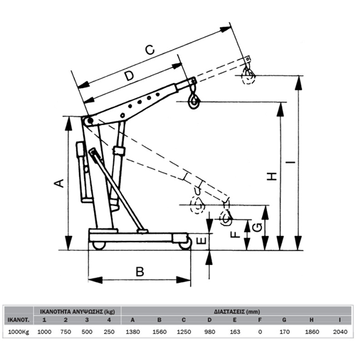 Αναδιπλούμενο Γερανάκι Μέγιστης Ανύψωσης Φορτίου 1000Kg με Υδραυλική Αντλία και Αυτόματης Επαναφοράς Διακόπτη Κατεβάσματος Φορτίου (Dead Man Switch), 4+2 Περιστρεφόμενους Μεταλλικούς Τροχούς για Εύκολη Μεταφορά Φορτίου και 4 Θέσεις Βραχίονα