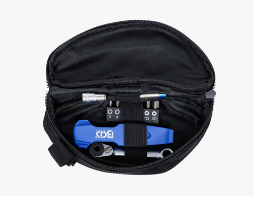 Όλα τα εργαλεία φυλάσσονται σε μια πρακτική, συσφικτική τσάντα για προσάρτηση στο πλαίσιο, τη σέλα ή τον στύλο του καθίσματος