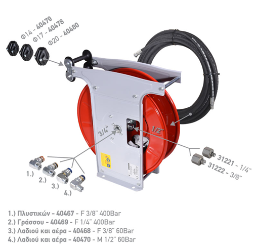 Αυτόματo καρούλι για εύκαμπτους σωλήνες κατάλληλο για τη διανομή υγρών και αέρα σε διαφορετικές συνθήκες πίεσης και θερμοκρασίας. Τα μέρη που έρχονται σε επαφή με το υγρά είναι μεταλλικά και υψηλής ποιότητας .