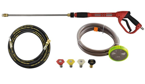 Με πλήρη εξοπλισμό: επαγγελματικό πιστόλι με σκανδάλη ασφαλείας, σωλήνα υψηλής πίεσης 8 μέτρων - BRAIDED, σωλήνα αναρρόφησης απορρυπαντικού 1 μέτρο με φίλτρο, ακροφύσια (0°, 15°, 40° και μπεκ απορρυπαντικού), σωλήνας αναρρόφησης από δεξαμενή με φίλτρο 3 μέτρα .