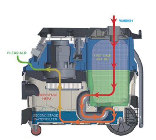 Εκτός από τις εργασίες μιας κλασικής σκούπας αναρρόφησης υγρών- στερεών, είναι ειδικά σχεδιασμένη για εξαιρετικά αποτελέσματα σε ιδιαίτερα απαιτητικές εργασίες με ηλεκτρικά εργαλεία (max. ισχύς 2000W), ηλεκτρικά τριβεία τοίχου και τριβεία αέρος φανοποιίας με χρήση του κάδου με νερό διασφαλίζοντας ένα καθαρό περιβάλλον με σχεδόν μηδενικούς ρύπους. Επίσης, εξασφαλίζει, με το πάτημα ενός εξωτερικού μπουτόν, αυτοκαθαρισμό του φίλτρου HEPA διασφαλίζοντας συνεχή υψηλή αναρροφητική ικανότητα. Διαθέτει επίσης λειτουργία φυσητήρα.