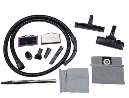 Συνοδεύεται με 2 σωλήνες σπιράλ, 2 πάνινες σακούλες, 1 προεκτάση πτυσσόμενη, φίλτρο HEPA, φίλτρο υγρών, φίλτρο στερεών, βουρτσάκι ημικυκλικό, εξάρτημα σχισμής, αντάπτορα τριβείων, αντάπτορα εργαλείων, πέλμα σκόνης & υγρών, βούρτσα χαλιών και μοκετών