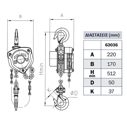 Παλάγκο αλυσίδας χειρός με Ικανότητα Ανύψωσης 3 Ton. / 3 m, Συμπαγής Κατασκευή με 2 Σημεία Στήριξης του Άξονα Μετάδοσης Κίνησης, με Αλυσίδα από Χάλυβα G80 Σύμφωνα με το ISO 16877