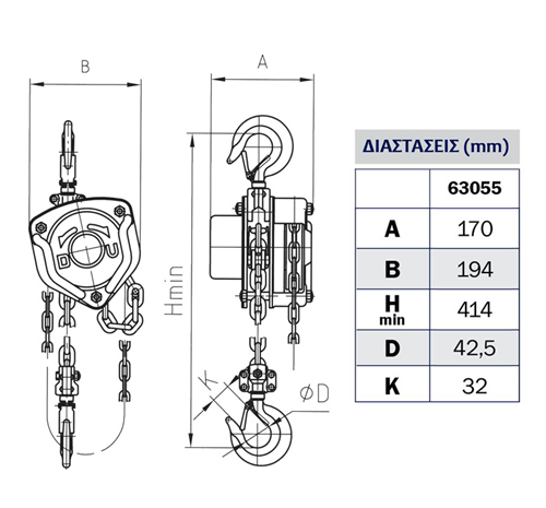 Παλάγκο αλυσίδας χειρός με Ικανότητα Ανύψωσης 2 Ton. / 3 m, Συμπαγής Κατασκευή με 2 Σημεία Στήριξης του Άξονα Μετάδοσης Κίνησης, με Αλυσίδα από Χάλυβα G80 Σύμφωνα με το ISO 16877