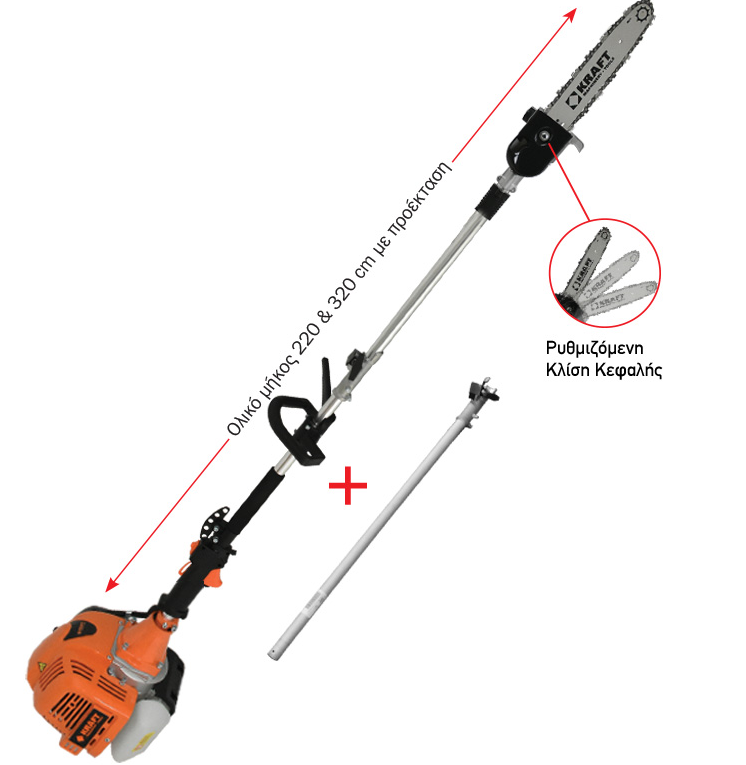 Κονταροπρίονο Βενζινοκίνητο Διαιρούμενο, Ισχυρό 52cc, 3HP με Ρυθμιζόμενη Κλίση Κεφαλής, Λάμα 25cm, Αλυσίδα 3/8”x1,3 mm και Προέκταση 100 cm