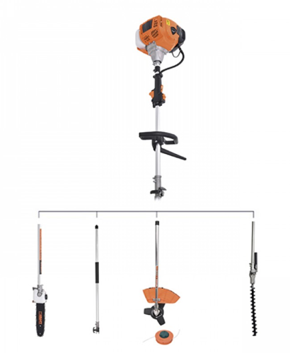 Πολυμηχάνημα κήπου βενζίνης 4 σε 1 με κινητήρα 52 cc, 2HP, και εξαρτήματα θαμνοκοπτικού, κονταροπρίονου, ψαλίδι μπορντούρας, προέκταση 100cm