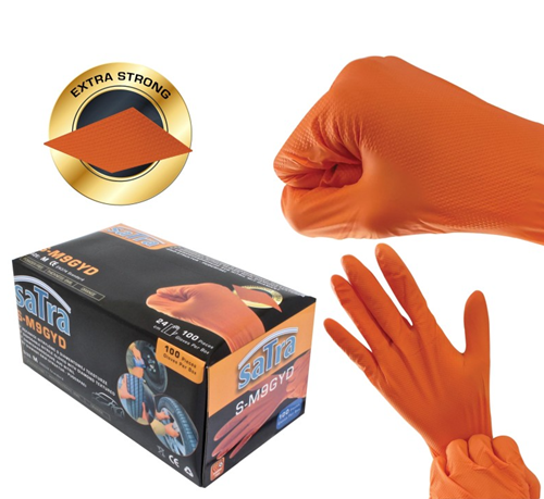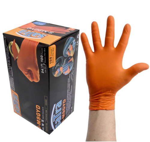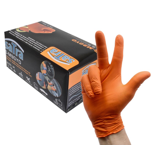 Γάντια νιτριλίου μιας χρήσης σε μέγεθος medium, σχεδιασμένα για να προστατεύουν τα χέρια από χημικά, λάδια, υγρασία και βρωμιά.